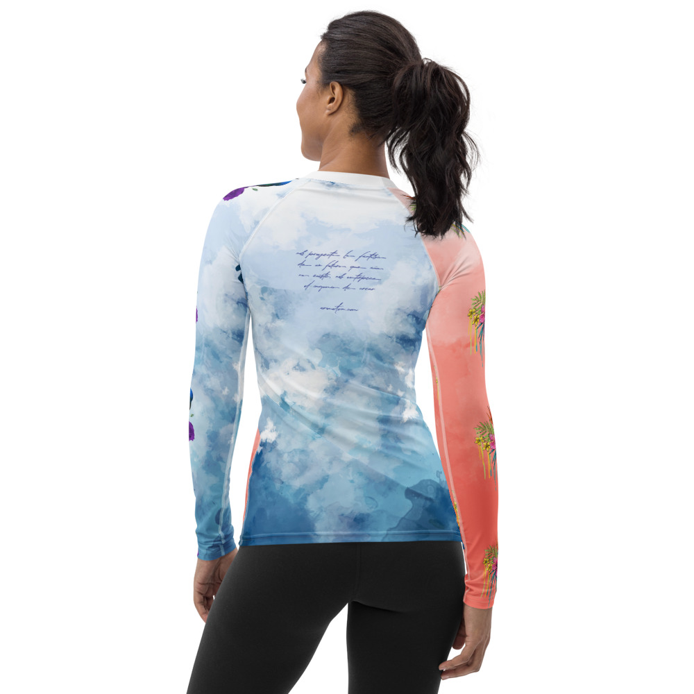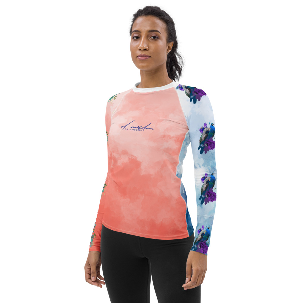 Camiseta desigual de manga larga, nubes, flores y aves y con cita: El miedo es ilusorio