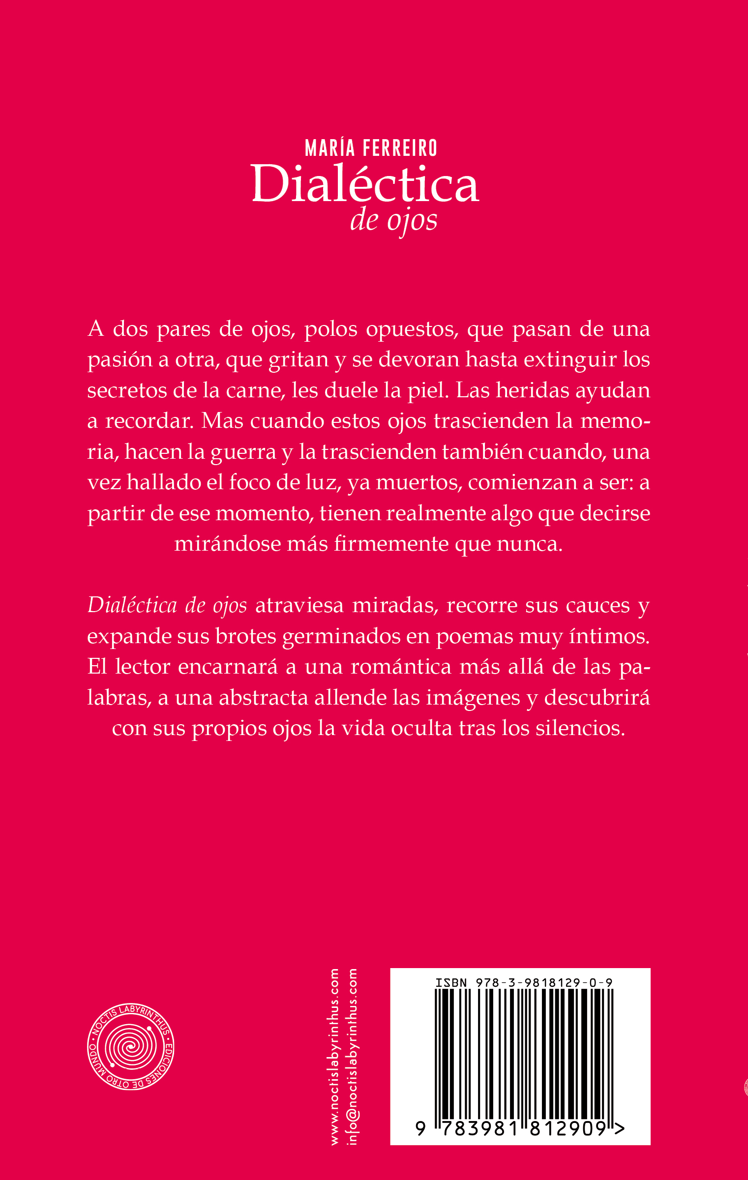 Dialéctica de ojos atraviesa miradas, recorre sus cauces y expande sus brotes germinados en poemas muy íntimos. El lector encarnará a una romántica más allá de las palabras, a una abstracta allende las imágenes, y descubrirá con sus propios ojos la vida oculta tras los silencios.
