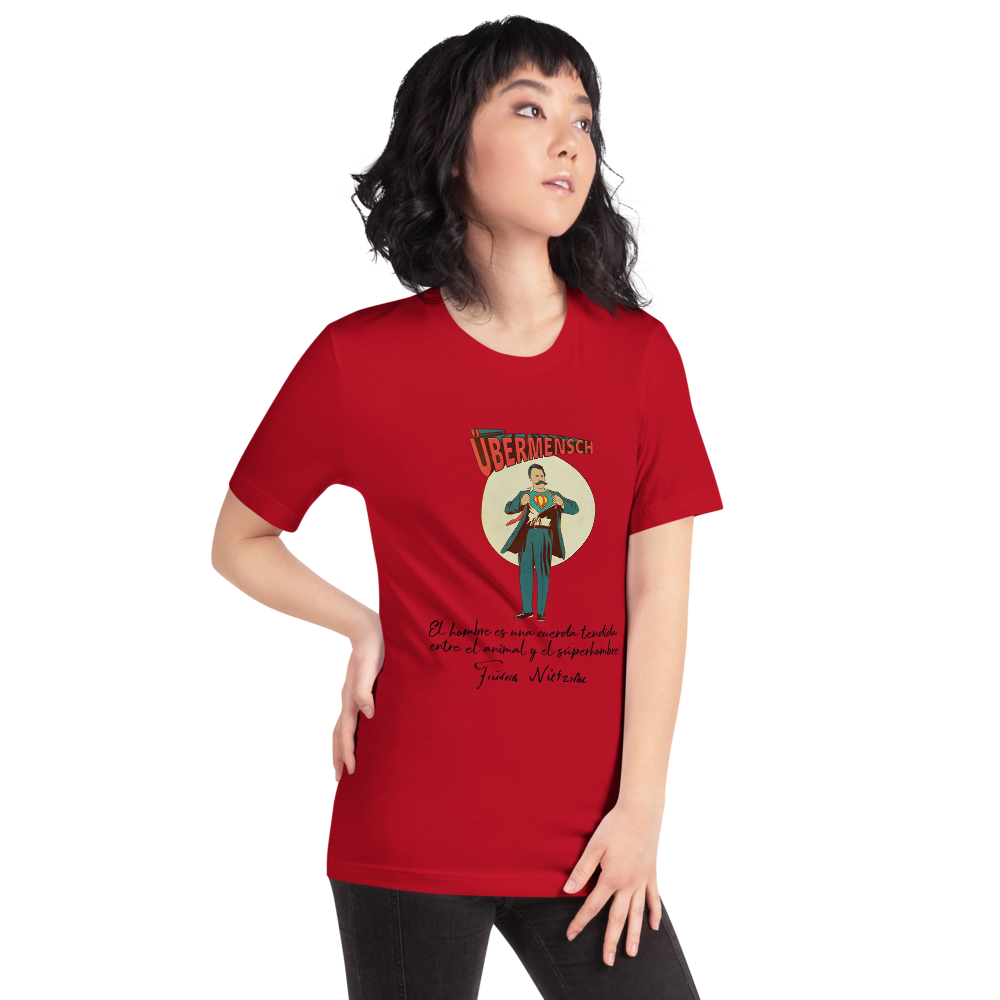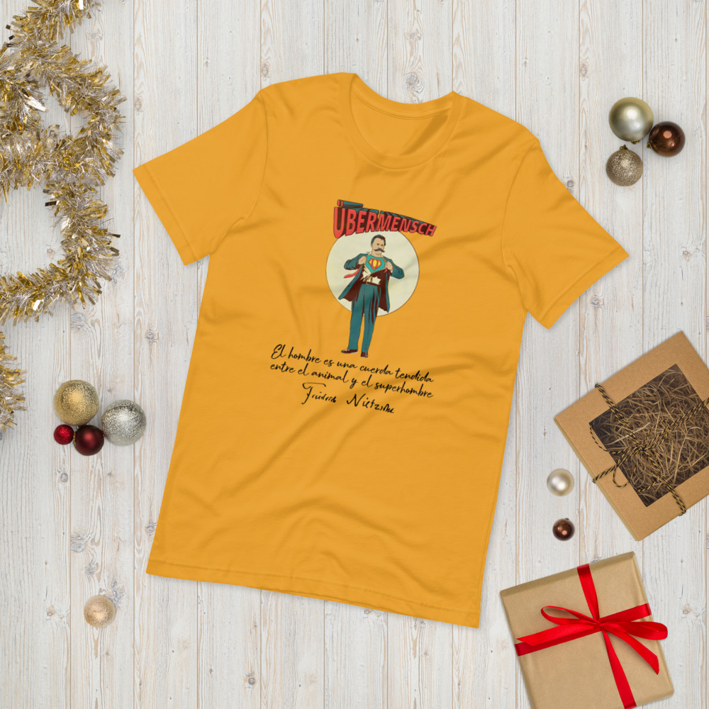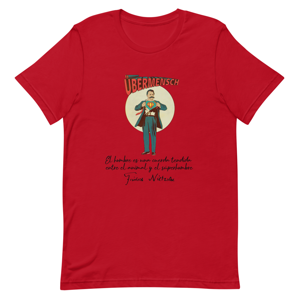 Y tú, ¿eres un supermán? Si es así, esta camiseta es el regalo perfecto para ti. Modelo unisex en rojo, amarillo o azul con un dibujo de Friedrich Nietzsche rasgándose la camisa para mostrar su verdadero traje de supermán. Abajo la cita nietzscheniana y la mismísima firma del filósofo alemán. Un diseño original, divertido y lleno de significado.