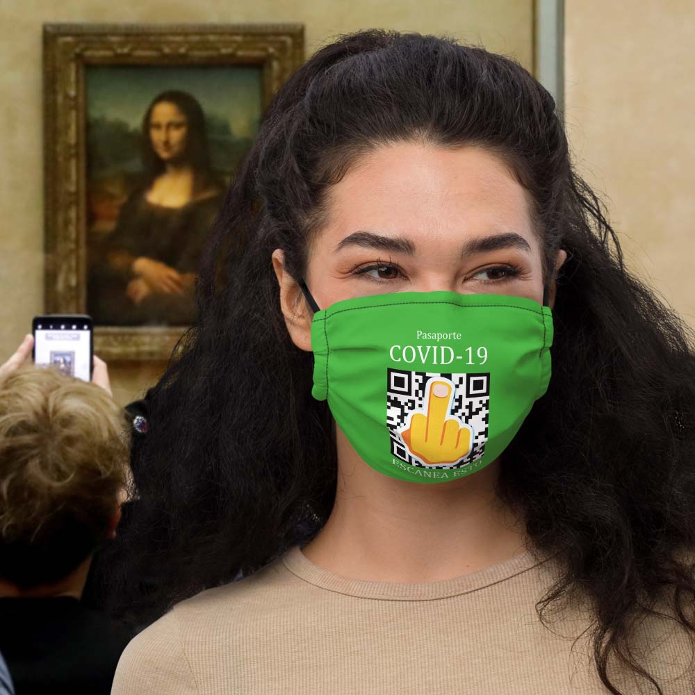 Las mascarillas se han convertido en tendencia desde el año 2020. Éste es el diseño perfecto para conspiranoicos, antivacunas y negacionistas a juego, además, con la camiseta antipasaporte. Protégete mientras la llevas puesta y ya nadie te podrá escanear el pasaporte covid. Si tú eres uno de ellos… ¡No dudes en conseguirla!