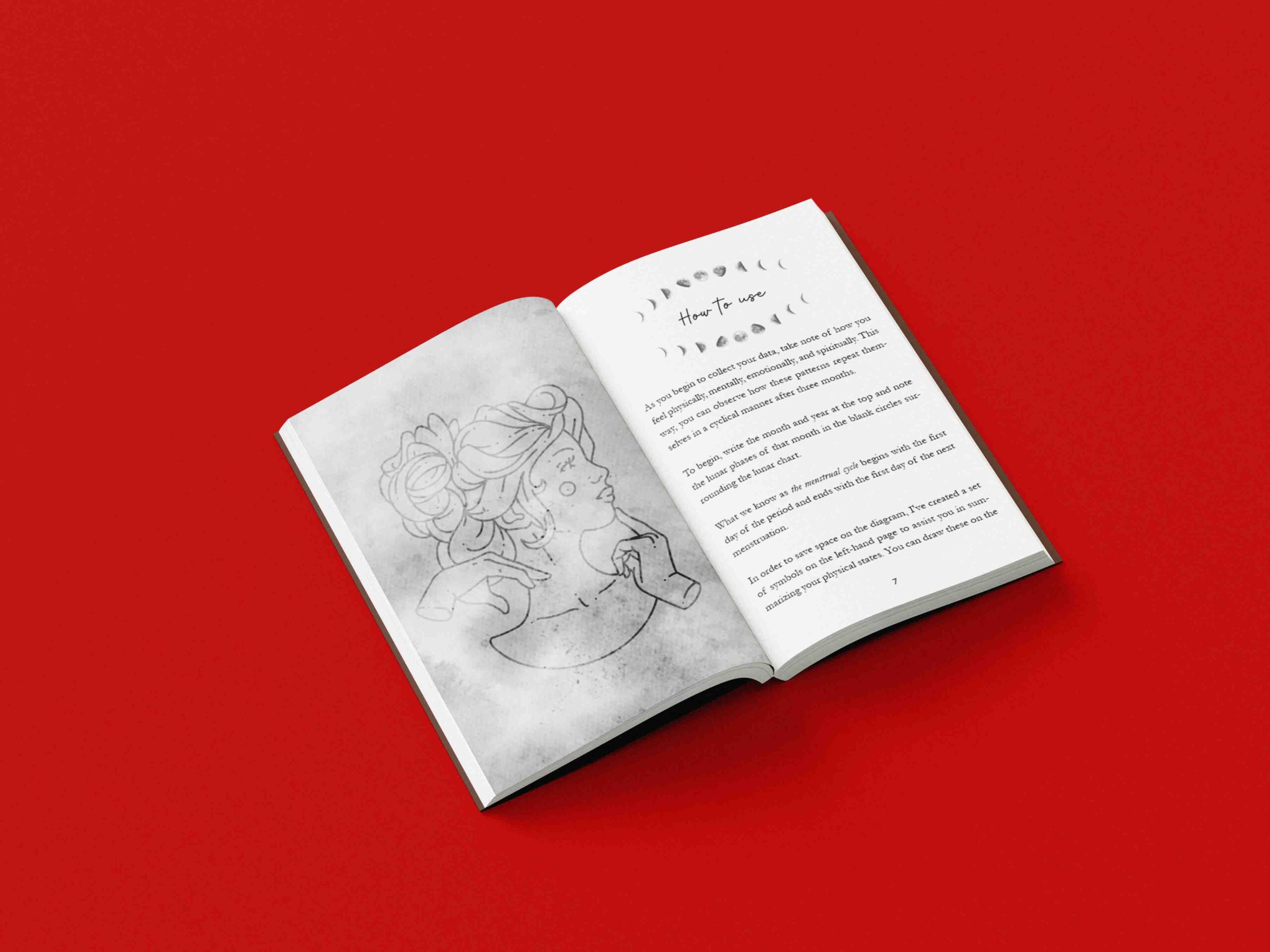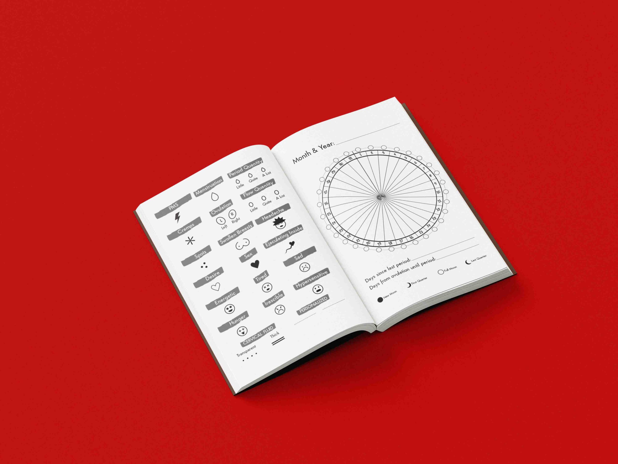 My Menstrual Moonary consists of a “moon wheel”, which is a circle divided into the days of the month, and allows you to record, through symbols, colors, and words, all the essential information about your menstrual cycle. In the following pages, you can add more details about each day of that month.