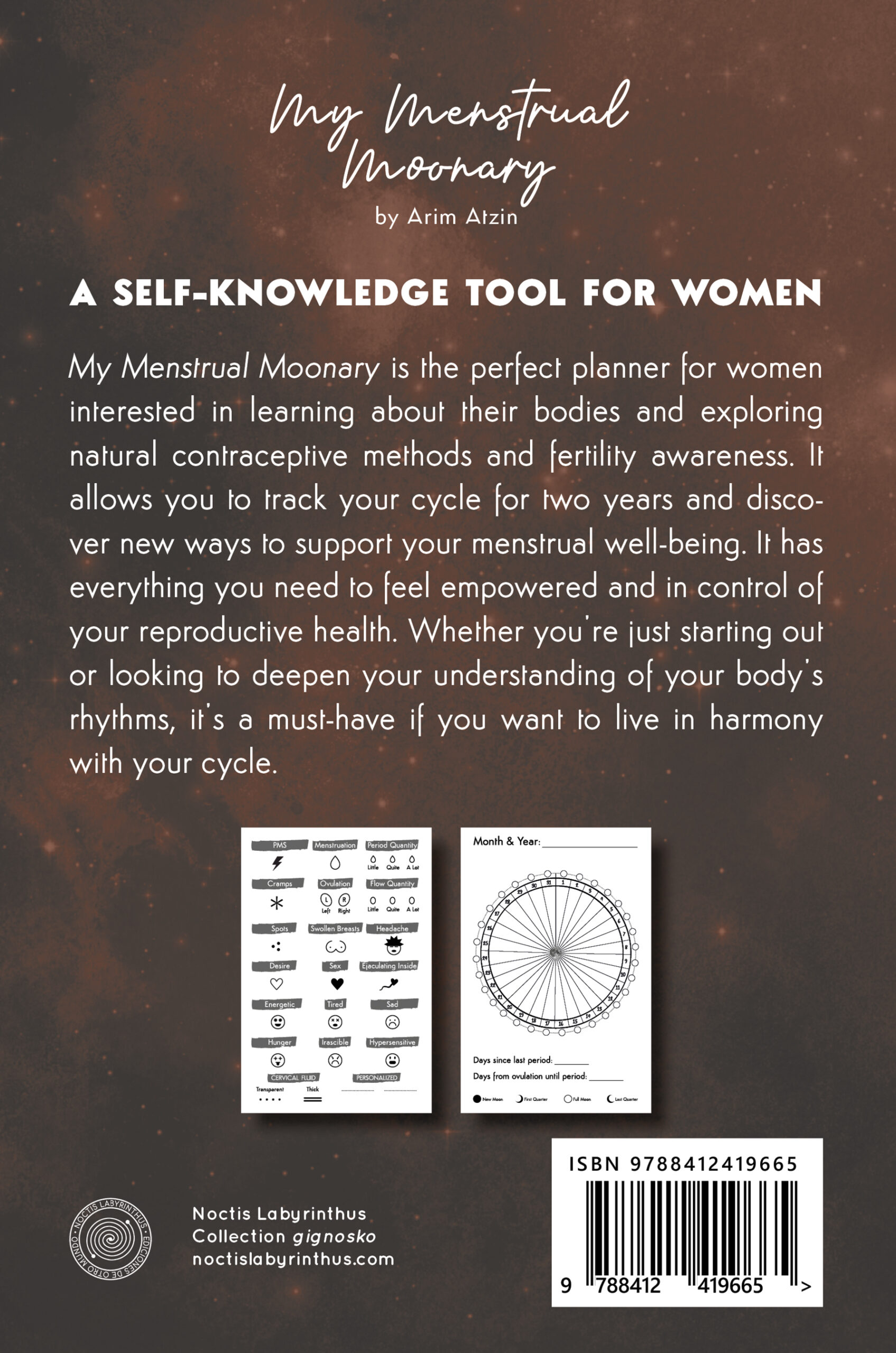 In My Menstrual Moonary, you can record everything that you consider important about your menstrual cycle on a monthly and daily basis, such as menstruation, ovulation, menstrual pain or cramps, swollen breasts, premenstrual syndrome, the characteristics of your cervical fluid and position of your cervix, how you feel, your sexual desire or relations, etc.