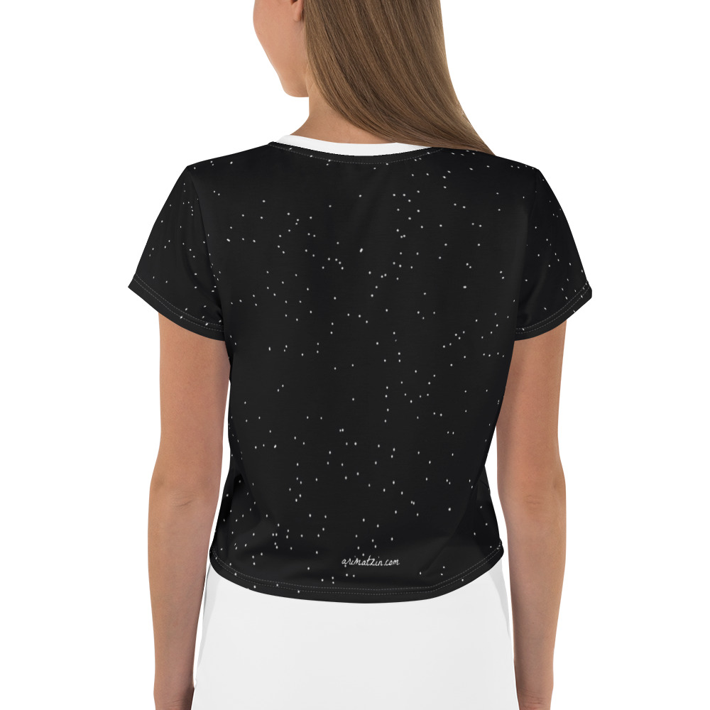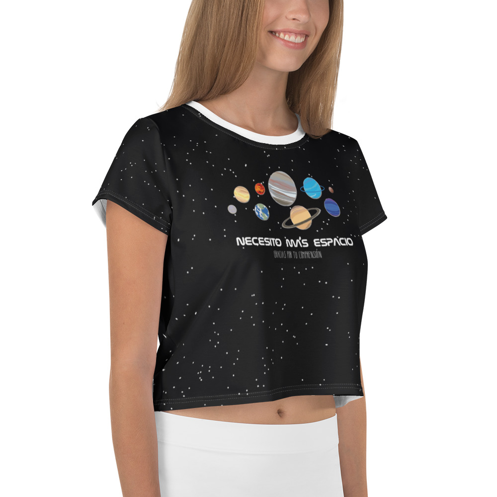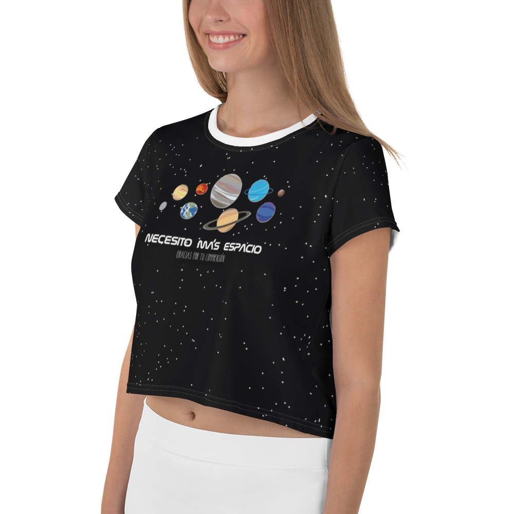 ¿Estás buscando tu próxima gran adquisición? ¡La tienes justo aquí! Esta camiseta corta femenina tiene un estampado con los planetas del Sistema Solar: Mercurio, Venus, Tierra, Marte, Júpiter, Saturno, Urano… e incluso Plutón, pues él nunca ha abandonado la órbita de nuestros corazones. Al fondo, los astros de la Galaxia, de nuestro Sistema Solar acompañan el tejido. Esta prenda ha sido especialmente cosida para encajar con tus gustos astronómicos.