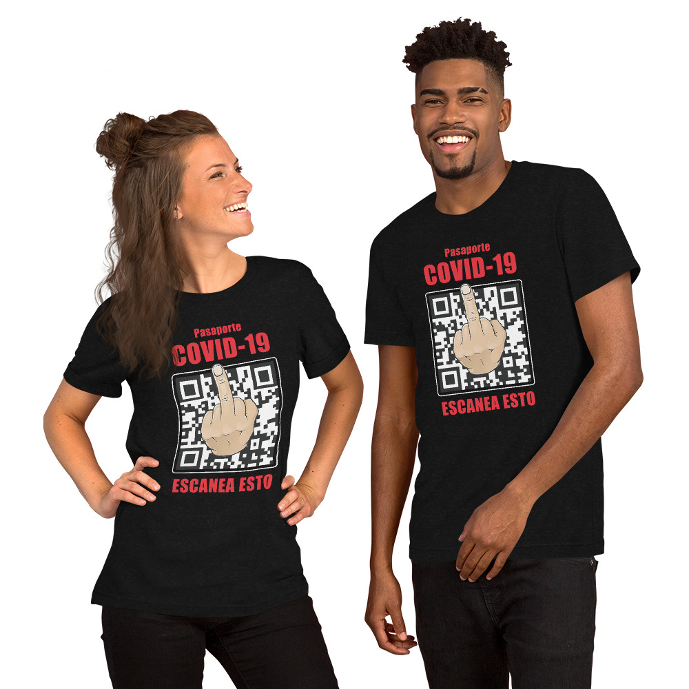Es la camiseta perfecta para conspiranoicos, antivacunas y negacionistas. Color negro, verde o rojo. También la tienes en otro modelo de color verde. A juego con la mascarilla antipass. Si te la pones, ya nadie te podrá escanear el pasaporte covid. Si tú eres uno de ellos… ¡No dudes en conseguirla!